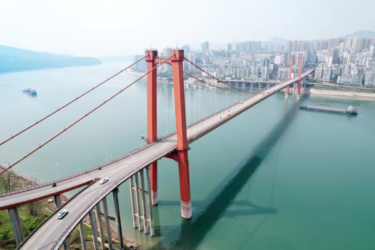 忠縣長江大橋全長1199.73m,主橋為單跨加勁桁架梁懸索橋,跨徑為560m,索塔高度分別為153.3m和142.3m,是重慶長江上第二座懸索橋,至今已“服役”22年。為保障橋梁運營安全和提高結構耐久