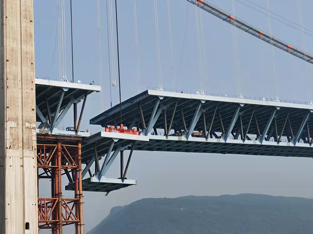 在大橋建造關(guān)鍵技術(shù)上,作為大跨徑公軌兩用橋梁,如何滿足軌道剛度指標(biāo)要求是橋梁設(shè)計的重點,更是難點。招商交科設(shè)計項目組根據(jù)橋位處實際地形條件,經(jīng)過多方案比選及論證,創(chuàng)新性提出采用“單孔懸吊雙塔三跨連續(xù)”的結(jié)構(gòu)體系,在不增加橋梁造價的前提下,巧妙解決了軌道剛度要求高等技術(shù)難題,使公軌兩用橋采用大跨度懸索橋成為可能,為類似工程的設(shè)計提供了寶貴經(jīng)驗。