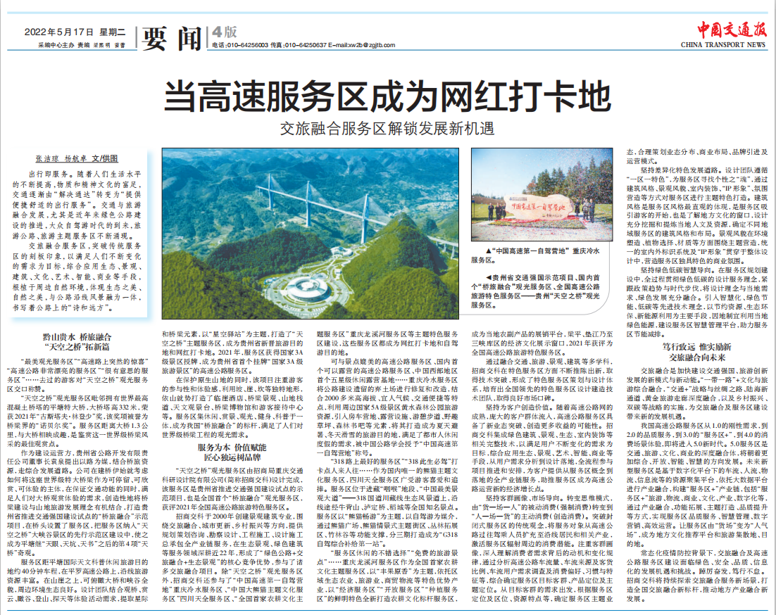 當天的《中國交通報》還以《當高速服務區(qū)成為網(wǎng)紅打卡地——交旅融合服務區(qū)解鎖發(fā)展新機遇》為題刊發(fā)專題報道,詳細介紹招商交科探索交旅融合發(fā)展之路。