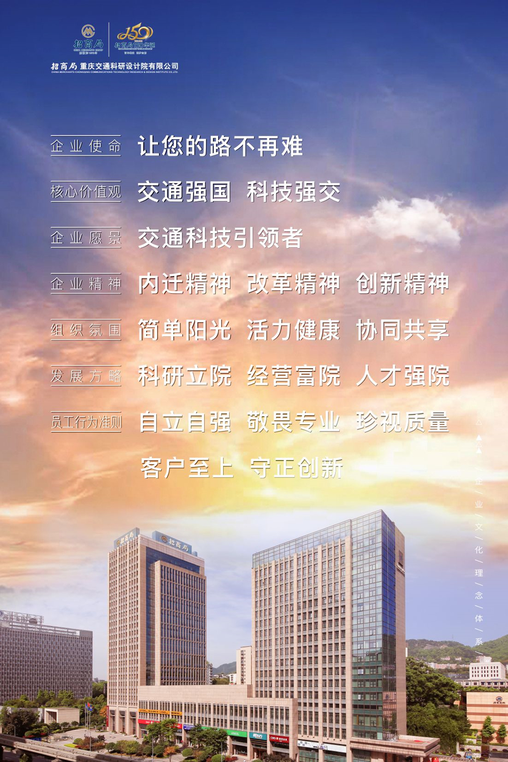 建院紀念日當天,招商交科在微信公眾號平臺上線了新時代招商交科企業(yè)文化理念體系電子海報,并組織在全公司各處顯示屏滾動播放,還印制紙質海報,組織本部各單位和下屬公司張貼于宣傳欄、文化走廊等處,以簡潔明了的形式彰顯招商交科的新面貌、新氣象。(招商交科供稿)