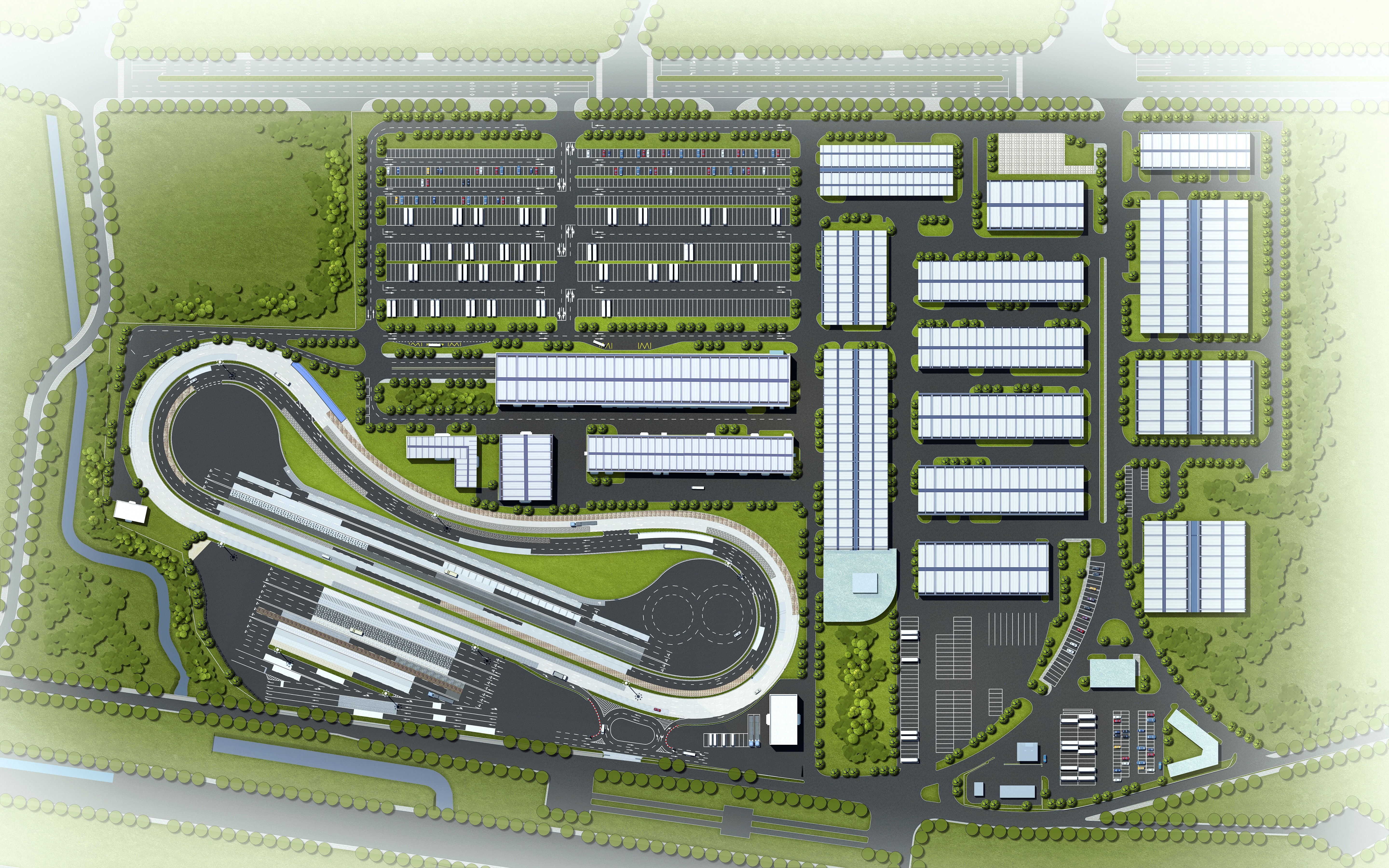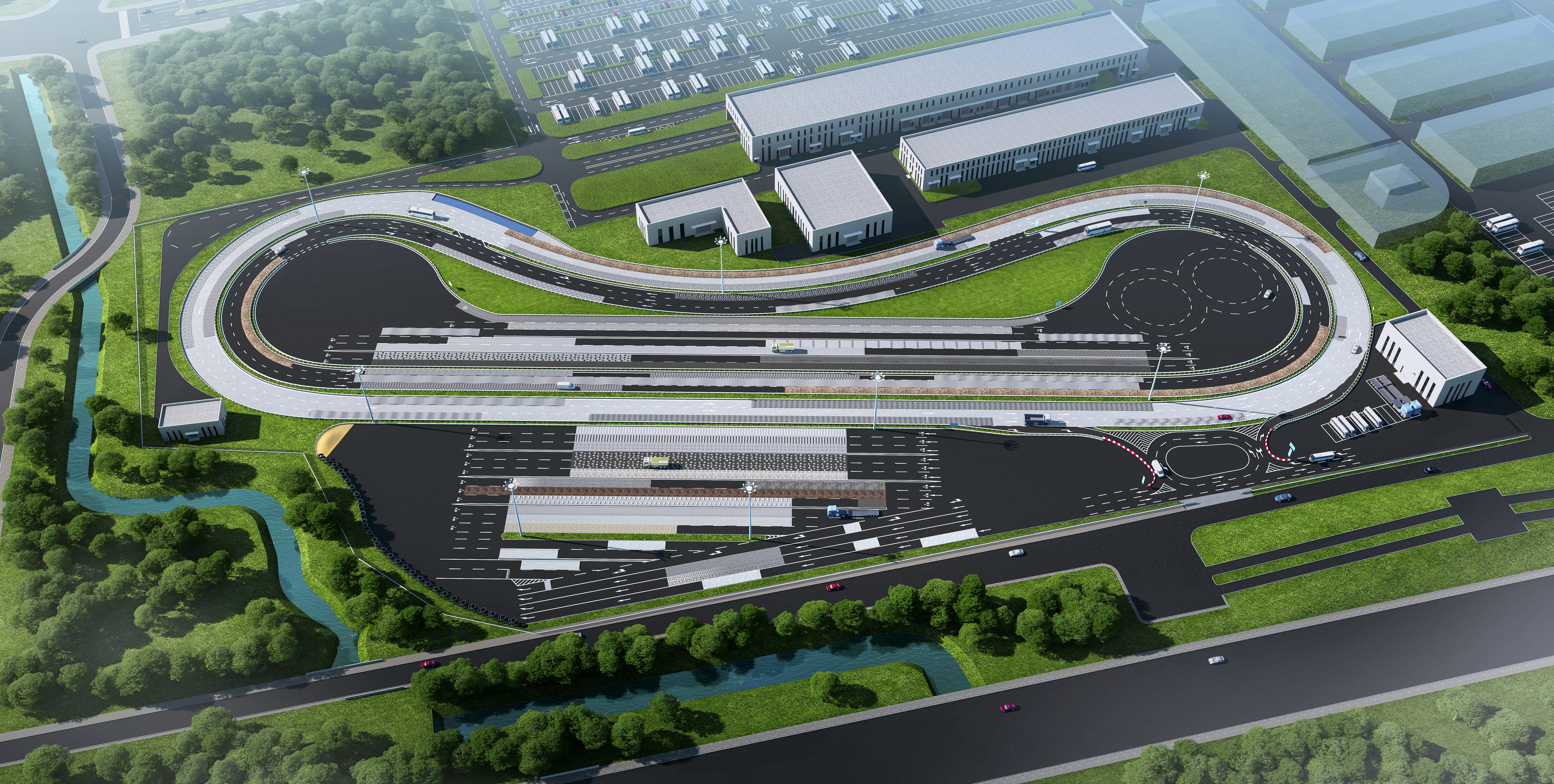 車檢院二期效果圖(鳥瞰圖) 新能源智能網(wǎng)聯(lián)汽車及智慧交通科技創(chuàng)新基地位于重慶市高新技術(shù)產(chǎn)業(yè)開發(fā)區(qū)金鳳電子信息產(chǎn)業(yè)園,總占地總面積16.76萬(wàn)㎡,其中試驗(yàn)道路占地7.89萬(wàn)㎡,包括氣囊誤作用試驗(yàn)道路、NVH評(píng)價(jià)試驗(yàn)道路、強(qiáng)化耐久試驗(yàn)道路等3個(gè)區(qū)域,涉及比利時(shí)路、維也納路、坑洼路、扭曲路、搓板路、波形路、顛簸路、凸塊路、魚鱗坑、卵石路等50多種特種道路。項(xiàng)目建成后,將用于汽車和摩托車新產(chǎn)品研究開發(fā)試驗(yàn)、標(biāo)準(zhǔn)驗(yàn)證及可靠性試驗(yàn)、相關(guān)法規(guī)試驗(yàn)等。