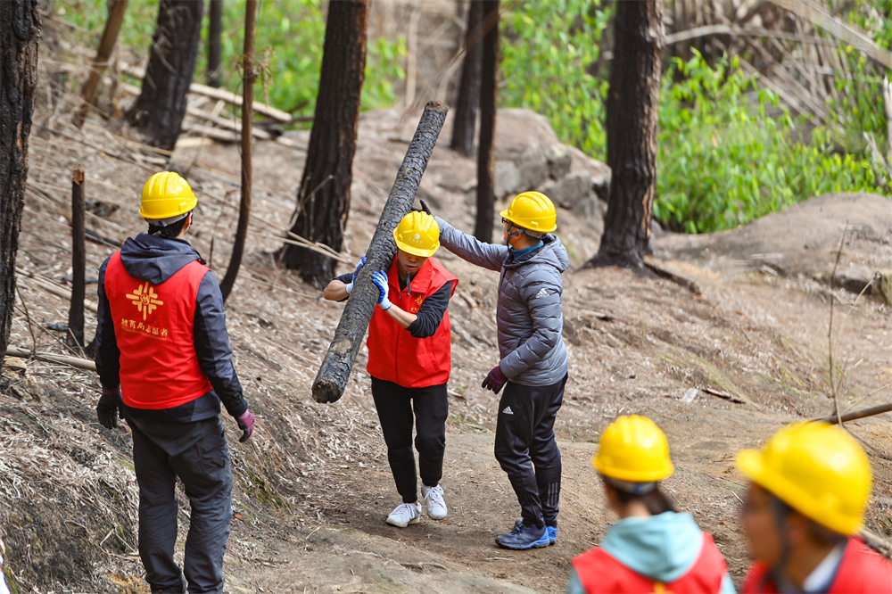 一群平日里拿“筆桿子”的科研工作者,滿懷公益熱忱,此刻化身招商局志愿者,一路向前,從鄉(xiāng)村道路到崎嶇山路再到陡峭山壁,從山下住戶到山火第一條隔離帶再到山火核心地帶,經(jīng)過一個多小時徒步前行,最終抵達(dá)待修繕路段,眼前的一幕幕景象深深震撼著每一位志愿者,隨處可見的殘根斷枝,焦黑色的痕跡猙獰可怖。望著這片受傷的山林,志愿者們心中的信念更加堅定了。