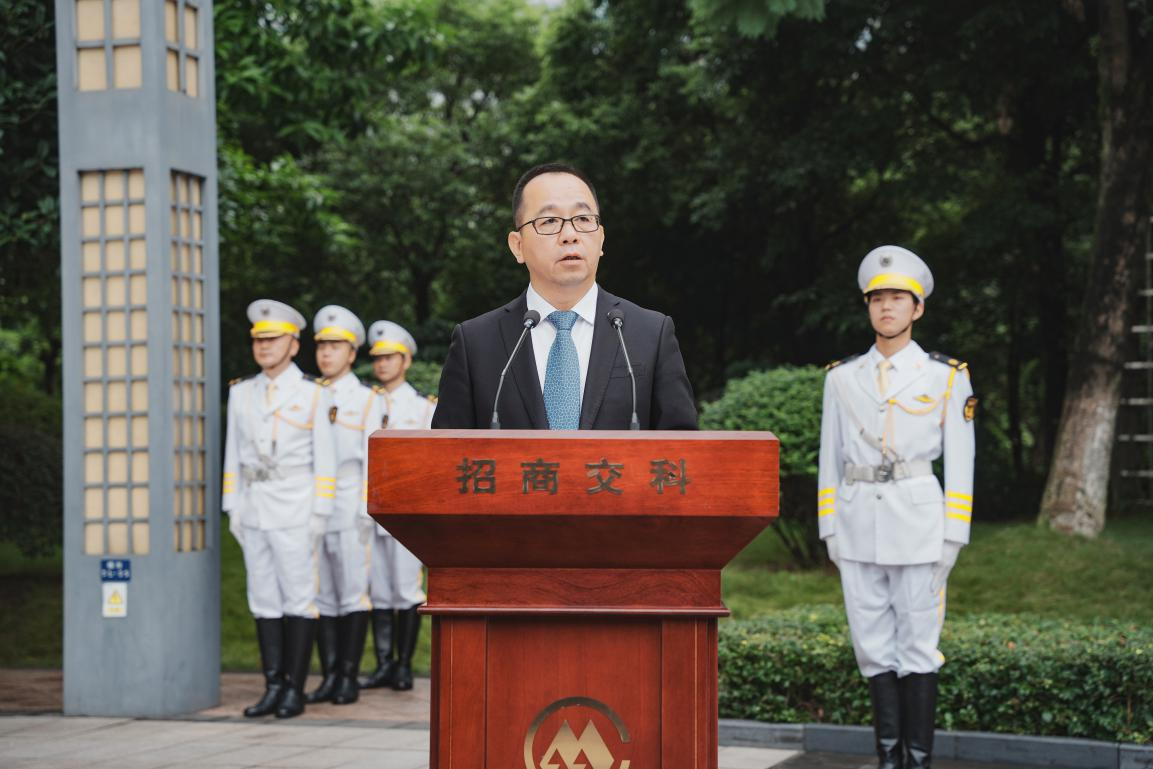 升旗儀式上,身著白色制服的儀仗隊(duì)員護(hù)著國旗、招商局旗,邁著整齊的步伐走向升旗臺(tái)。在《國歌》和《招商局之歌》的莊嚴(yán)歌聲中,五星紅旗和招商局旗先后冉冉升起,迎風(fēng)飛揚(yáng)。