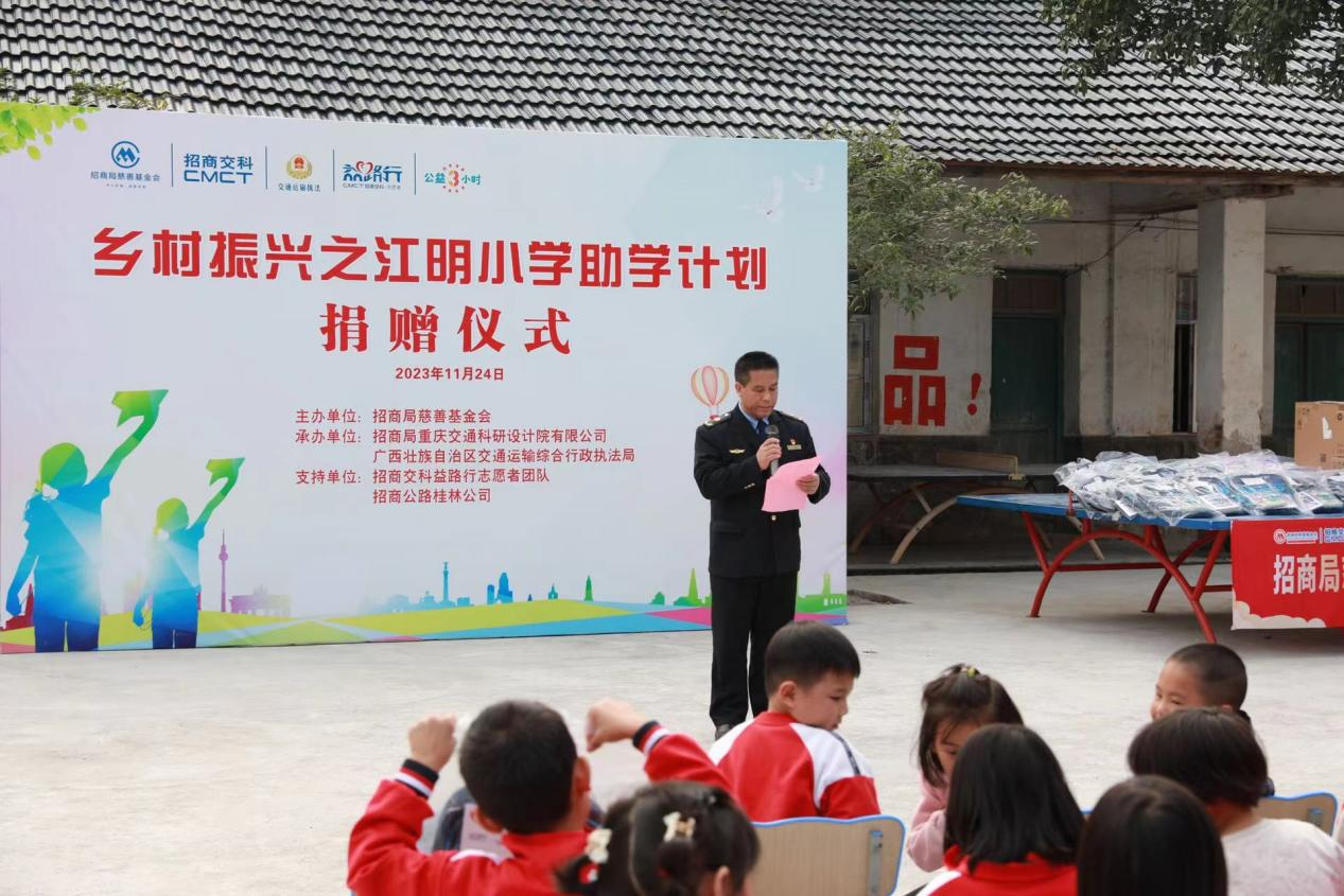 彭金濤在捐贈儀式致辭中表示,經(jīng)廣西交通執(zhí)法局推介和招商交科廣西分公司實地考察,江明小學助學項目得到招商局慈善基金會和招商交科的高度重視和大力支持,在征得校方同意后,先后為學校捐贈了一批急需教學物資和愛心書籍,希望以此為江明小學鄉(xiāng)村振興與校園助學貢獻綿薄之力,同時也期待這項“聯(lián)動一家親活動”能夠持續(xù)開展,讓學生在愛心V書屋中享受閱讀,在閱讀的過程中了解世界和培養(yǎng)良好的習慣。