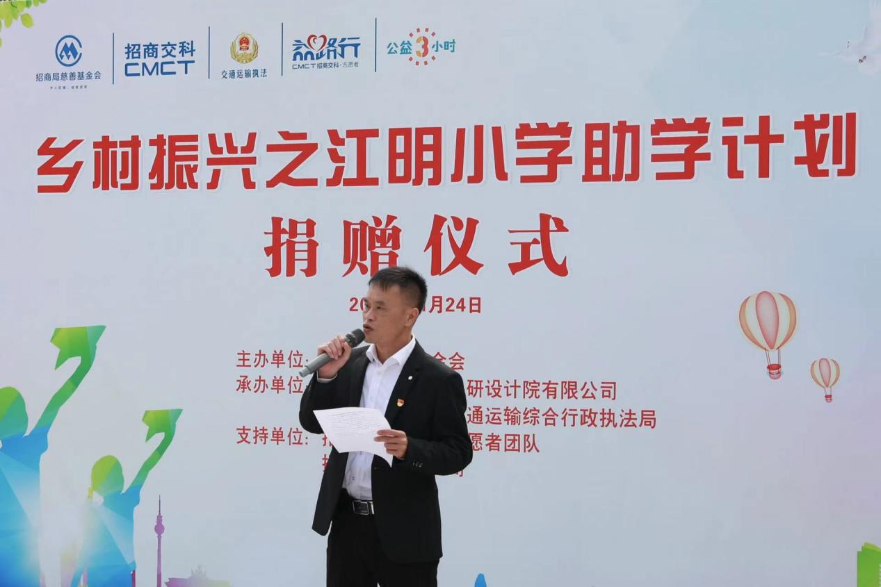 招商交科黨委委員、首席運營官彭金濤出席活動并致辭,廣西交通執(zhí)法局黨委書記曾泯棋、副局長朱愛清,招商公路桂林公司黨委委員、總經(jīng)理助理韋積分,廣西全興高速公路發(fā)展有限公司黨支部負責人、副總經(jīng)理謝大文,廣西壯族自治區(qū)桂林市全州縣副縣長馬文吉及全州縣安和鎮(zhèn)江明村、中心校、江明小學的領(lǐng)導(dǎo)以及招商交科廣西分公司、駐廣西項目部的員工代表約60人參加了本次活動。
