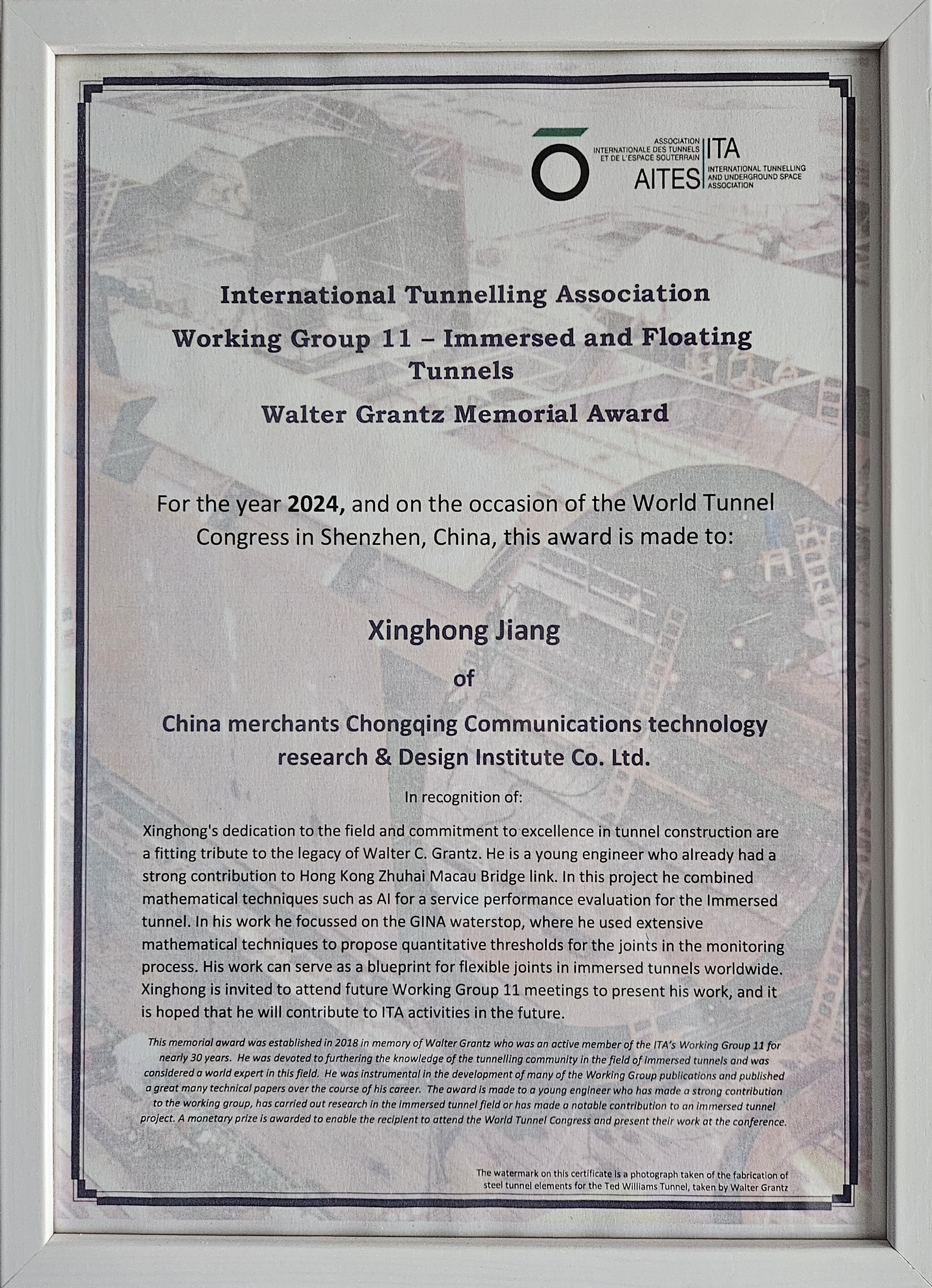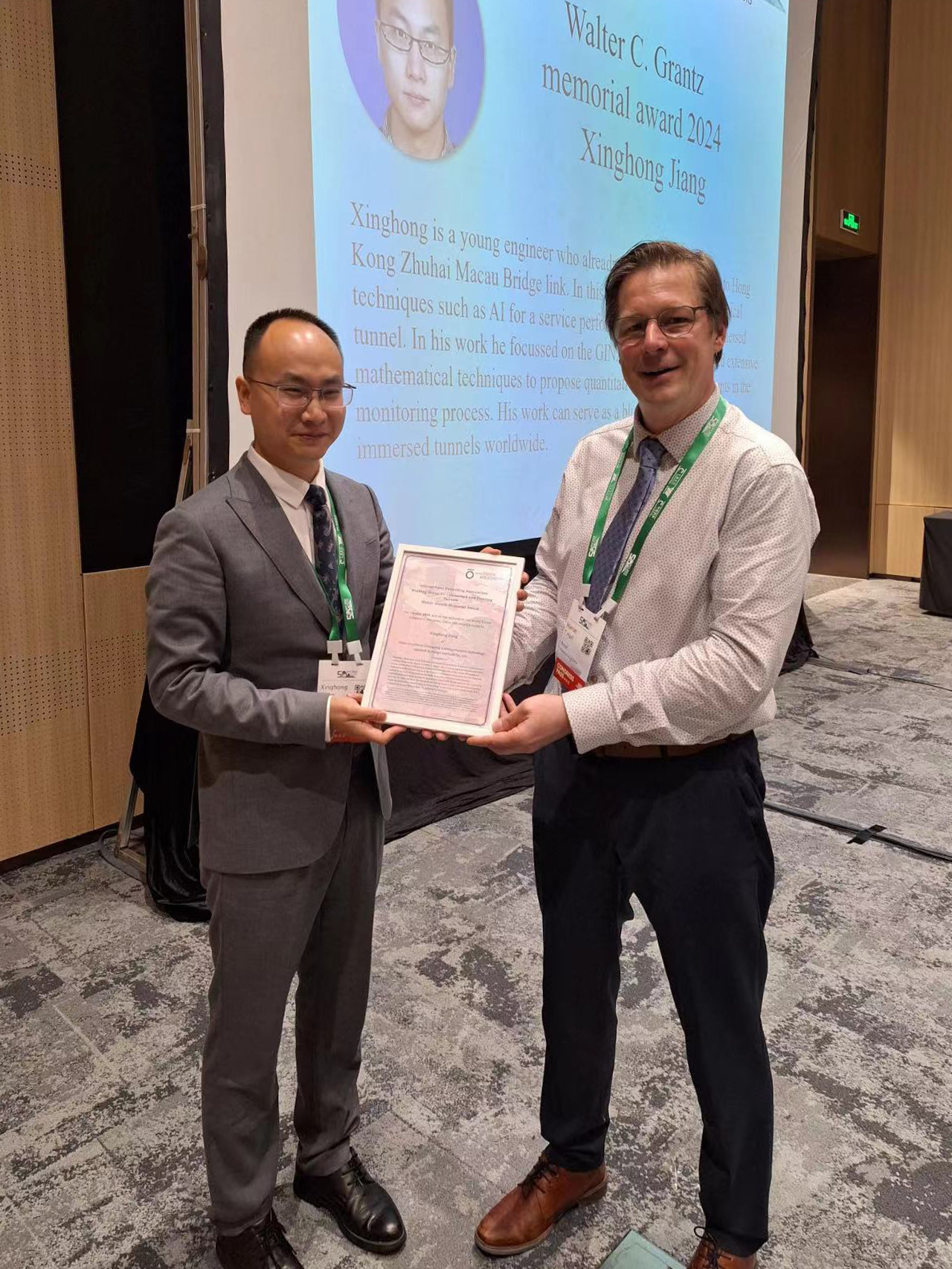 Walter Grantz紀念獎由國際隧協(xié)沉管與懸浮隧道工作組國家代表提名、工作組評定,每年進行一次,用于表彰在沉管或懸浮隧道領(lǐng)域做出重要貢獻的青年工程師。江星宏及所在團隊——隧道研究院在沉管隧道體系、指標與標準方面,構(gòu)建了沉管隧道綜合服役性能評定體系,建立了接頭局部向整體推演的數(shù)理模型,提出了沉管隧道接頭量化評定指標與標準,為沉管隧道的服役安全提供了堅實的保障。