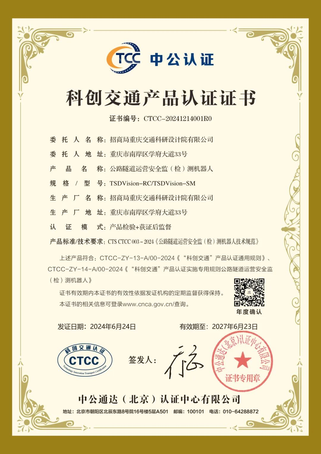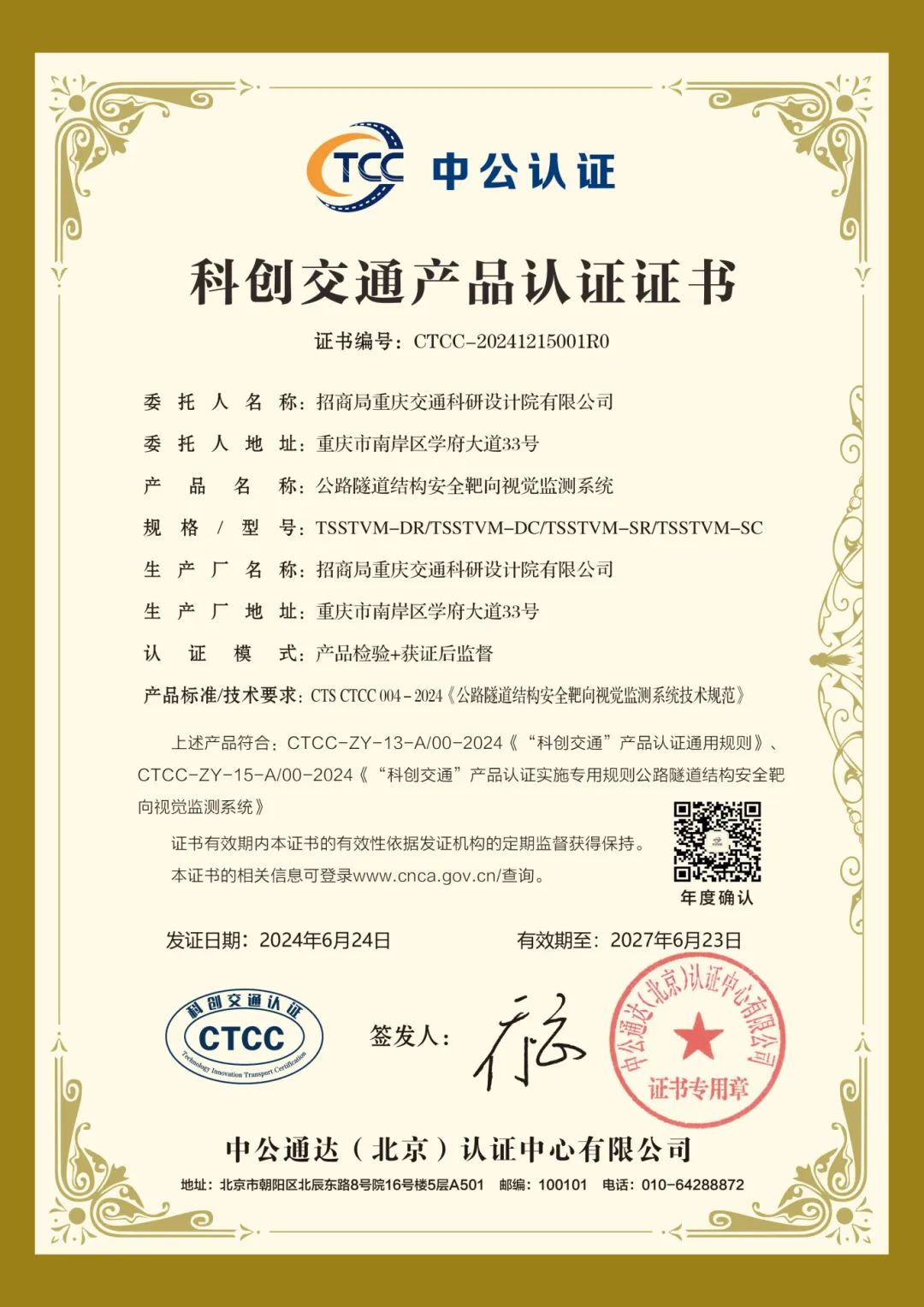 中國(guó)公路學(xué)會(huì)副秘書長(zhǎng)、中公認(rèn)證董事長(zhǎng)喬云向招商交科隧道與地下工程研究院副院長(zhǎng)胡居義頒發(fā)了認(rèn)證證書,發(fā)布儀式現(xiàn)場(chǎng)播放了國(guó)工中心科技產(chǎn)品視頻宣傳片,吸引了行業(yè)和媒體廣泛關(guān)注。