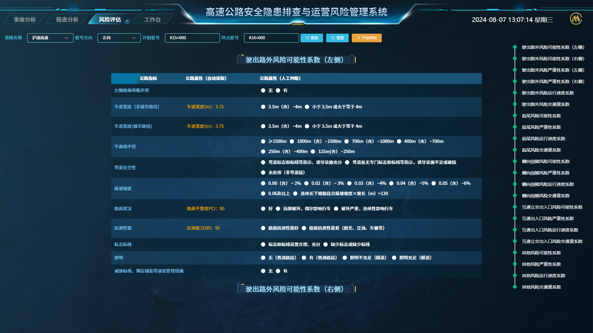 研發(fā)團(tuán)隊(duì)對(duì)高速公路運(yùn)營(yíng)安全隱患進(jìn)行全面梳理、聚類分析,歸類為道路線形不良、視距不良、路面積水、排水設(shè)施缺陷等76種安全隱患,建立了《高速公路運(yùn)營(yíng)安全隱患排查清單》,明確運(yùn)營(yíng)安全隱患排查要點(diǎn)。通過(guò)系統(tǒng)建立運(yùn)營(yíng)安全隱患電子臺(tái)賬,計(jì)算隱患嚴(yán)重指數(shù)并評(píng)估隱患等級(jí),輔助運(yùn)營(yíng)管理人員制定運(yùn)營(yíng)安全隱患排查計(jì)劃,大幅提升運(yùn)營(yíng)安全隱患排查工作效率。