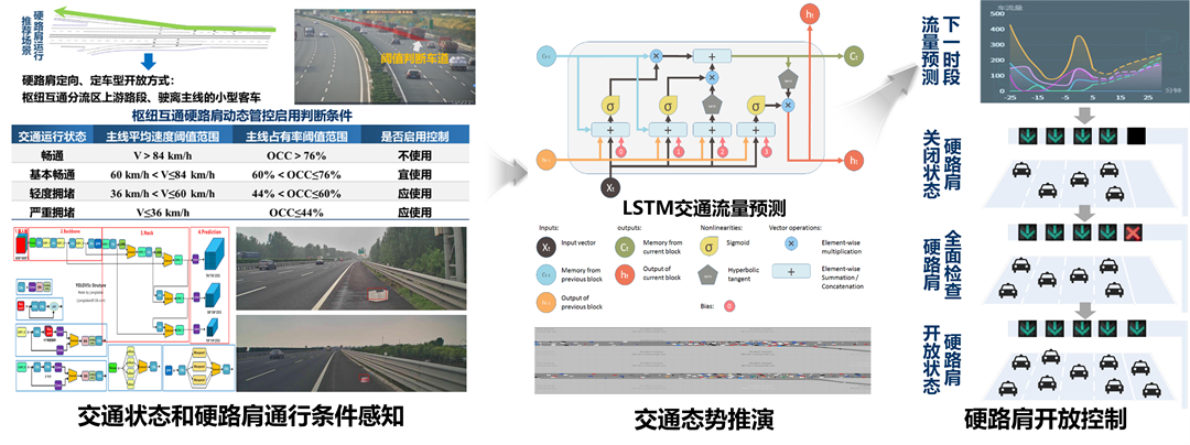 團隊提出安全導(dǎo)向、效率提升的樞紐互通上游段硬路肩定向定車型開放策略及運行管理方式;研發(fā)了仿真推演驅(qū)動的硬路肩動態(tài)管控算法,以及基于機器視覺的硬路肩路面狀況實時監(jiān)測算法;基于“交通狀態(tài)感知-交通流量預(yù)測-交通態(tài)勢推演-硬路肩開放”,實現(xiàn)了交通流量激增下,高速公路樞紐互通上游段硬路肩動態(tài)管控。硬路肩動態(tài)開放應(yīng)用在樞紐互通上游段可提升20%以上的通行能力,相當(dāng)于新增了一個行車道。