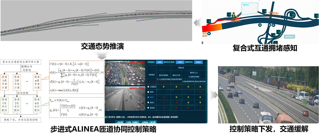 團隊針對相鄰短間距互通形成的復(fù)合式互通,在“感知-預(yù)測-研判-管控”的框架下,考慮交通狀態(tài)的耦合特性,提出了雙匝道自適應(yīng)協(xié)同控制方法;研發(fā)了復(fù)合式互通合流區(qū)雙匝道步進式ALINEA控制算法、主線提前換道與入口匝道協(xié)同控制算法,解決了復(fù)合式互通復(fù)雜交織段通行能力降低的問題。步進式協(xié)同匝道控制應(yīng)用在復(fù)合式互通合流區(qū)可減少16%的車輛延誤,有效降低了交織沖突引發(fā)的交通事故。