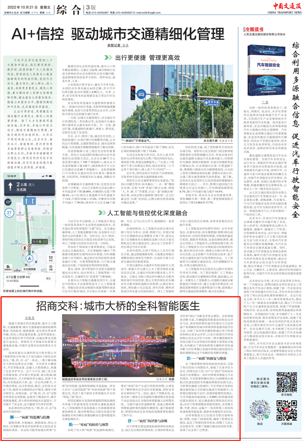 2022年10月21日,《中國交通報》在第三版以《招商交科:城市大橋的全科職能醫(yī)生》為題,全文刊發(fā)橋梁研究院文章,展現(xiàn)招商交科通過開發(fā)智能設備,融入大數(shù)據(jù)理念,構建全息養(yǎng)護平臺等多種方式,解決城市大橋的運維安全問題,為建設交通強國、數(shù)字中國貢獻交科方案。