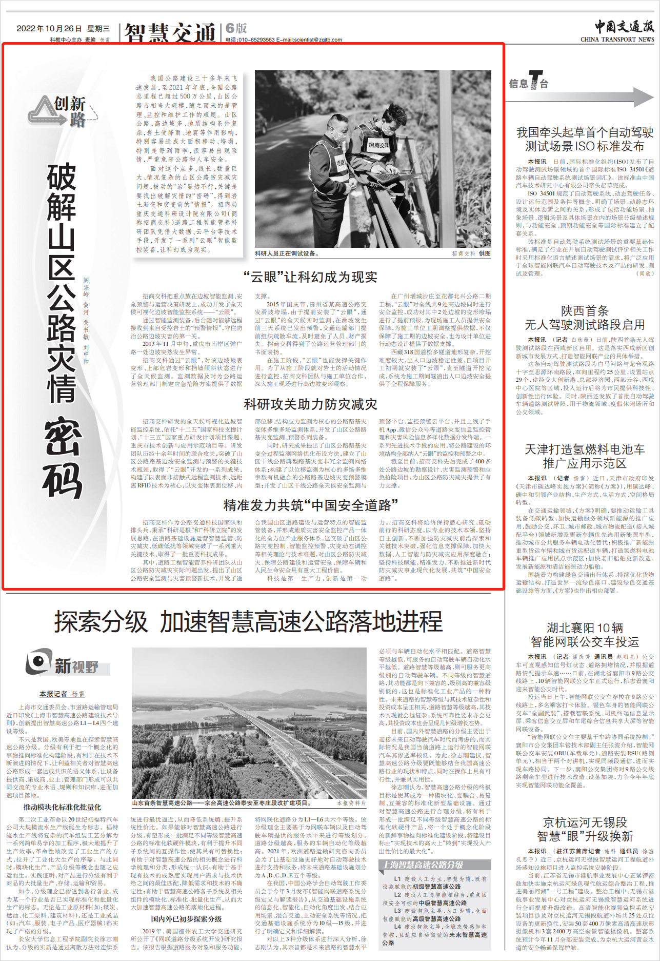 10月26日,《中國交通報》在第6版全文刊發(fā)道路研究院文章《破解山區(qū)公路災(zāi)情“密碼”》,文章介紹了招商交科始終立足專業(yè),堅持自主創(chuàng)新,加強防災(zāi)減災(zāi)前沿技術(shù)探索,強化信息支撐保障,加快大數(shù)據(jù)、人工智能與防災(zāi)減災(zāi)應(yīng)用深度融合;堅持科技賦能,精準(zhǔn)發(fā)力,不斷推進(jìn)新時代防災(zāi)減災(zāi)事業(yè)現(xiàn)代化發(fā)展,共同助力“中國安全道路”?,F(xiàn)將全文轉(zhuǎn)載如下: