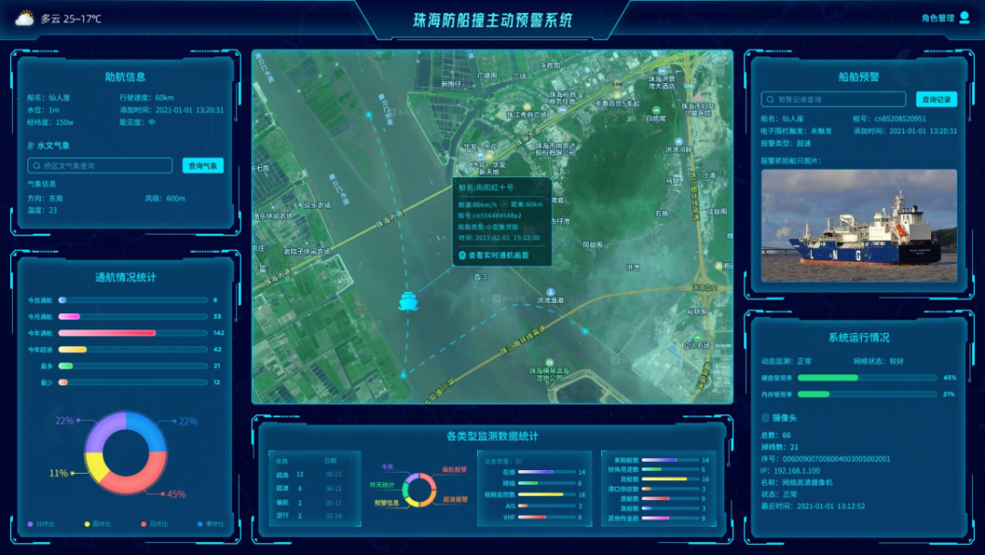 依托港珠澳大橋橋梁主體工程防船撞預警工程專項設計工作項目、珠海大橋主動防船撞項目,物康科技攻堅克難,研發(fā)出適用于超寬水域的紅外熱成像主動防船撞超高檢測裝置、船舶信息收發(fā)器等具有自主知識產(chǎn)權(quán)的行業(yè)專用裝備,形成基于AIS+微波雷達多源數(shù)據(jù)融合的船舶偏航檢測等技術(shù);破解了超寬水域超高檢測單一數(shù)據(jù)來源偏航檢測結(jié)果的實時性與可靠性不可兼得,通航環(huán)境復雜、氣候條件惡劣的海洋環(huán)境下跨江(海)特大橋主動防船撞預警等行業(yè)難題;做到多種監(jiān)測技術(shù)集成、多源數(shù)據(jù)融合、多層次區(qū)域預警,有效提高了橋梁和航道的運營安全管理水平。