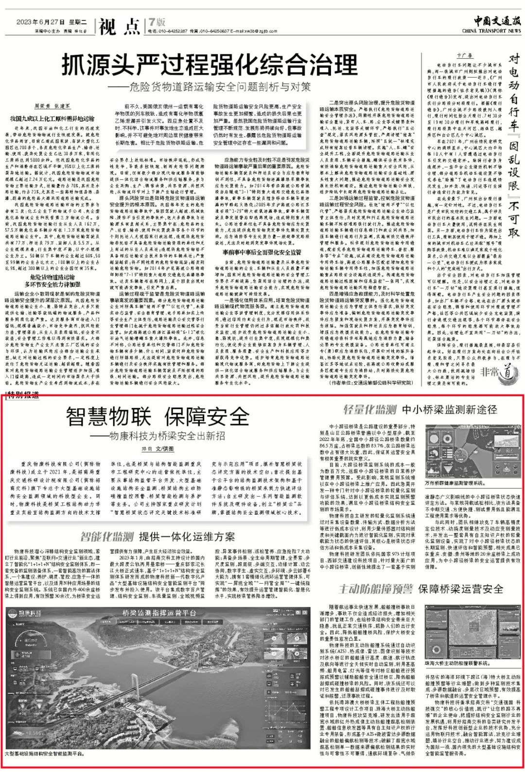 6月27日,在物康科技成立2周年之際,《中國交通報》在第七版和微信公眾號全文刊發(fā)了文章《智慧物聯(lián) 保障安全——物康科技為橋梁安全出新招》。文章詳細介紹了物康科技在結(jié)構(gòu)監(jiān)管平臺開發(fā)、大型基礎設施結(jié)構(gòu)安全監(jiān)測、橋梁結(jié)構(gòu)主動防碰撞監(jiān)控預警、橋梁智能檢測與養(yǎng)護等領域的技術(shù)和能力?,F(xiàn)將全文轉(zhuǎn)載如下: