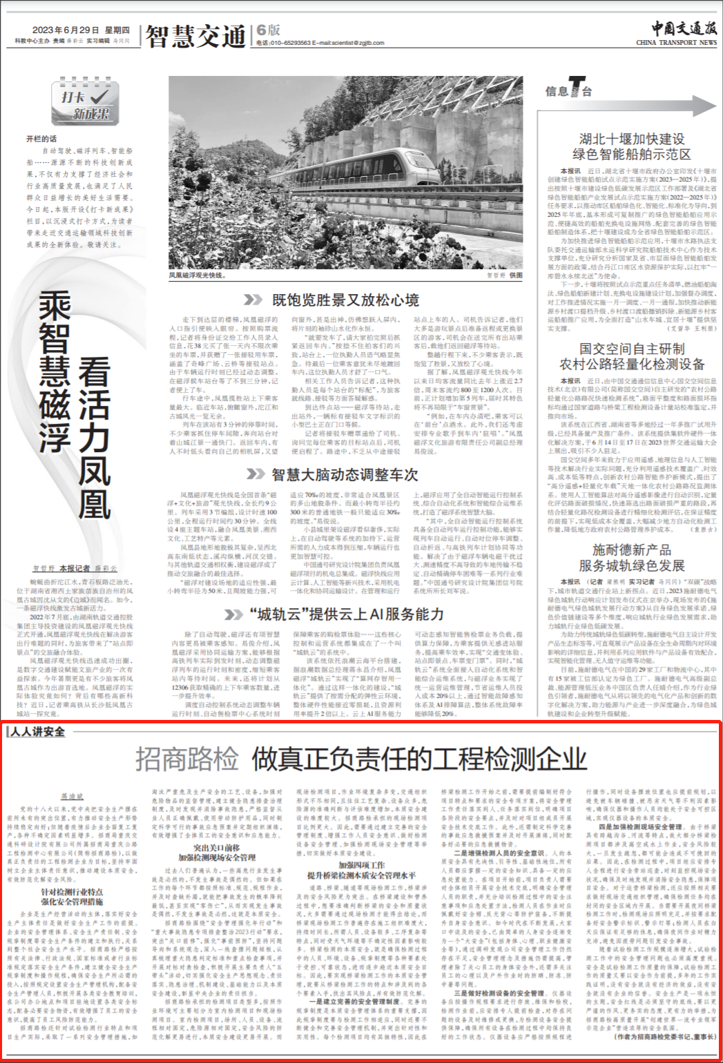 今年六月是第22個(gè)全國(guó)“安全生產(chǎn)月”,《中國(guó)交通報(bào)》6月29日在第六版全文刊發(fā)了招商交科下屬招商路檢黨委書(shū)記、董事長(zhǎng)蔣迪斌署名文章《招商路檢 做真正負(fù)責(zé)任的工程檢測(cè)企業(yè)》。文章介紹了招商路檢堅(jiān)持牢固樹(shù)立企業(yè)主體責(zé)任意識(shí),推動(dòng)建設(shè)本質(zhì)安全,有效防范化解安全風(fēng)險(xiǎn)。現(xiàn)將全文轉(zhuǎn)載如下: