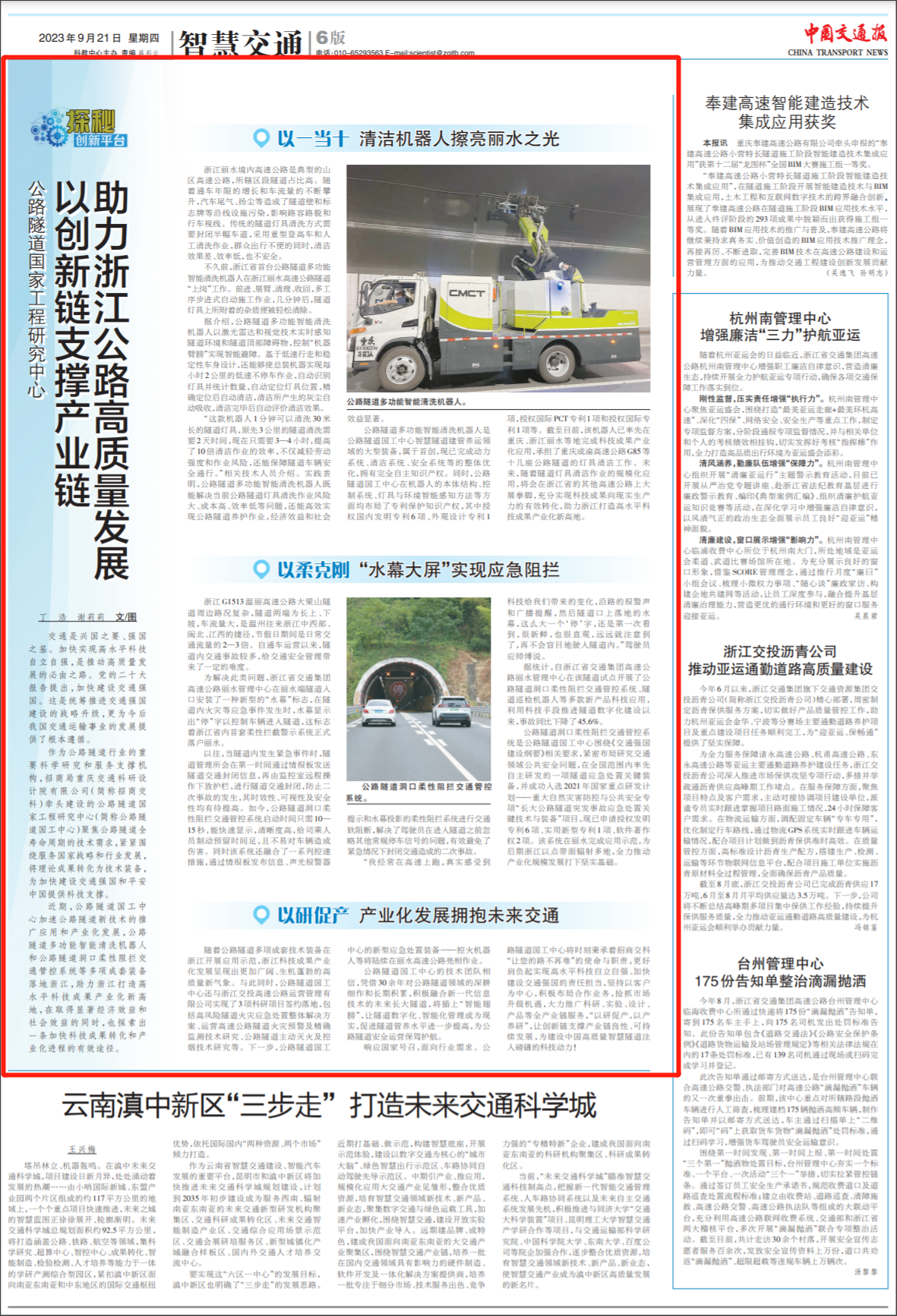2023年9月21日,《中國交通報(bào)》在第6版以《創(chuàng)新鏈支撐產(chǎn)業(yè)鏈發(fā)展 公路隧道國家工程研究中心助力浙江打造高水平科技成果產(chǎn)業(yè)孵化新高地》為題,刊發(fā)了招商交科公路隧道國家工程研究中心有關(guān)報(bào)道。報(bào)道聚焦長大公路隧道成套技術(shù)裝備的示范應(yīng)用,介紹招商交科“公路隧道多功能智能清洗機(jī)器人”“公路隧道洞口柔性阻攔交通管控系統(tǒng)”等裝備落地浙江,并與浙江地方企業(yè)展開科研項(xiàng)目合作,助力浙江打造高水平科技成果產(chǎn)業(yè)化新高地,加速我國公路隧道新技術(shù)的推廣應(yīng)用和產(chǎn)業(yè)化發(fā)展的具體情況?,F(xiàn)將全文轉(zhuǎn)載如下:
