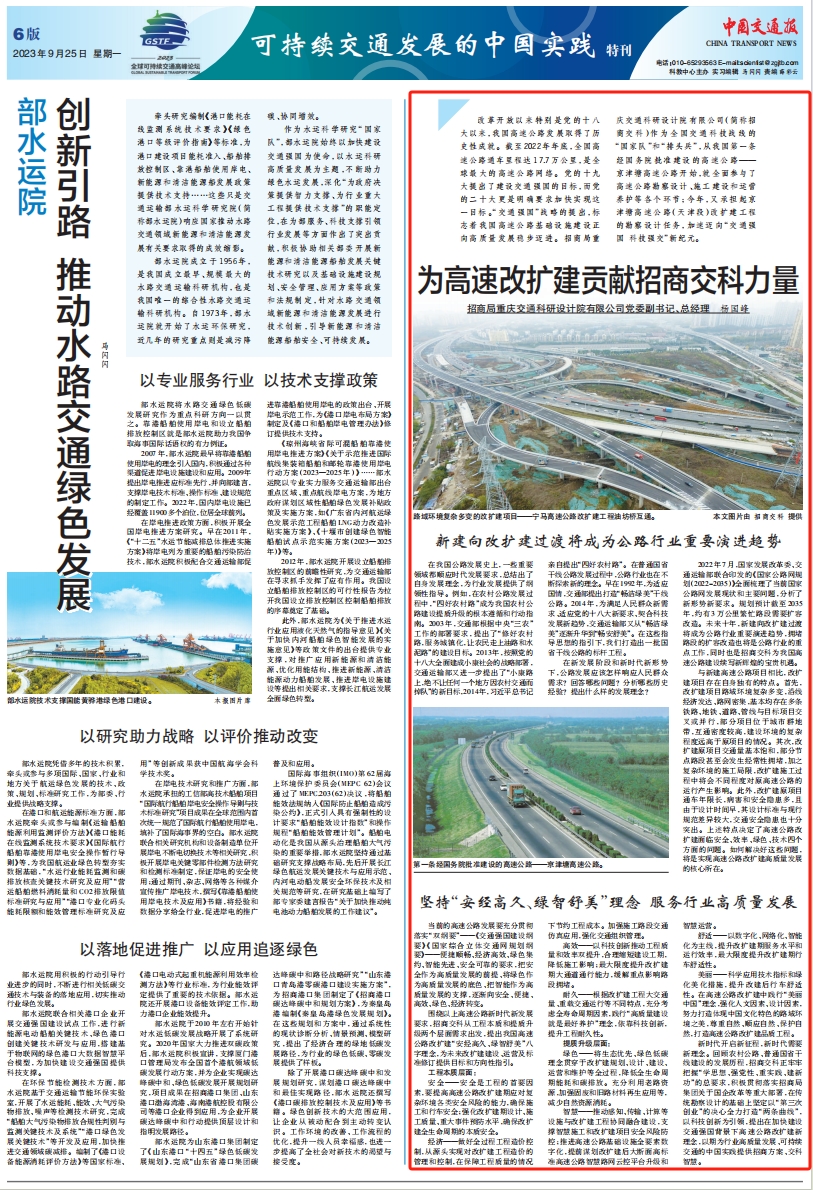 9 月 25 日,《中國交通報》在第六版《可持續(xù)交通發(fā)展的中國實踐》特刊,全文刊發(fā)了招商交科黨委副書記、總經(jīng)理楊國峰的署名文章《為高速改擴建貢獻招商交科力量》。