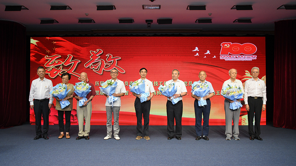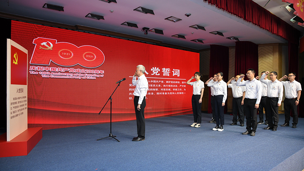 王福敏向應邀參會的已退休公司主要負責人、科技工作者、老黨員的代表致敬,并送上祝福鮮花。他還帶領新黨員向黨旗莊嚴宣誓,參會的全體黨員共同重溫入黨誓詞。